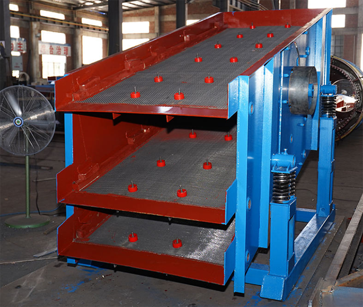 礦用振動篩是我公司自行研制的一種新型 篩分設備,主要用于冶金、礦山、煤炭、建材、電力、化工等大塊狀物料及中小顆粒物料的篩分行業,尤以冶金行業用途為廣泛,是高爐槽下、焦化廠、選礦廠常用的篩分機械。該產品 具有體積小、重量輕,能耗低、便于安裝及工藝布置等特點,采用能耗低振動電機作振動源,橡膠彈簧支撐并隔振,處理量大,篩分效率高,篩網有較大的安裝傾角,拼塊組裝篩板,更換方便,使用壽命長。